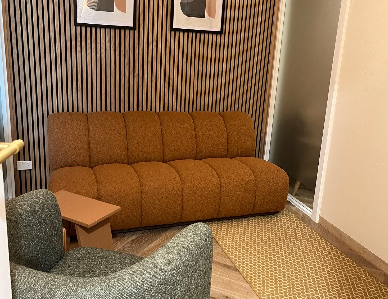 The rooms lend themselves to a true counselling environment with comfortable sofas, armchairs and good size desks for writing in a soft well lit modern setting. There is a well equipped front desk with all the expected amenities for general administrative tasks. In addition a touch screen system is connected to the internet solely purposed for making future bookings or quick access to email and printing facilities, which are handled by a multifunction printer-copier. WI fI is available in the building. There are also kitchen and bathroom facilities on the same floor. The rooms are managed by psychologist Lynda Knell who would kindly welcome any queries or questions about the rooms or how to register to book online. Lynda can be contacted on 0457 935 742 or at Lynda.Knell@gmail.com